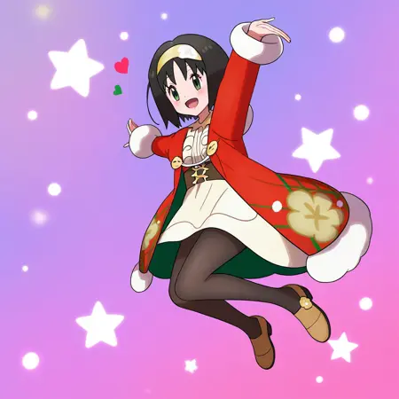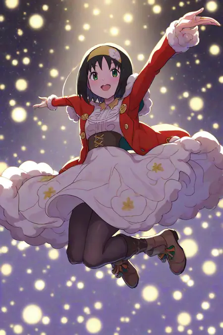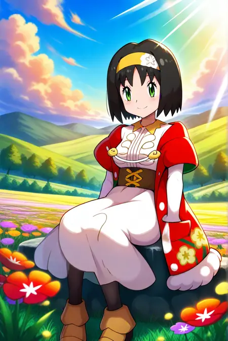 holerika, erika_\(pokemon\), black_hair, short_hair, bangs, hairband, yellow_hairband, long_sleeves, official_alternate_costume, dress. white_dress, jacket, red_jacket, floral_print, long_dress, pantyhose, black_pantyhose, brown_footwear