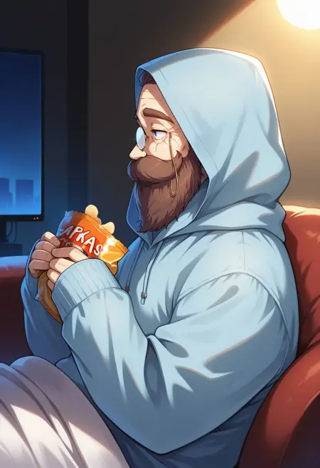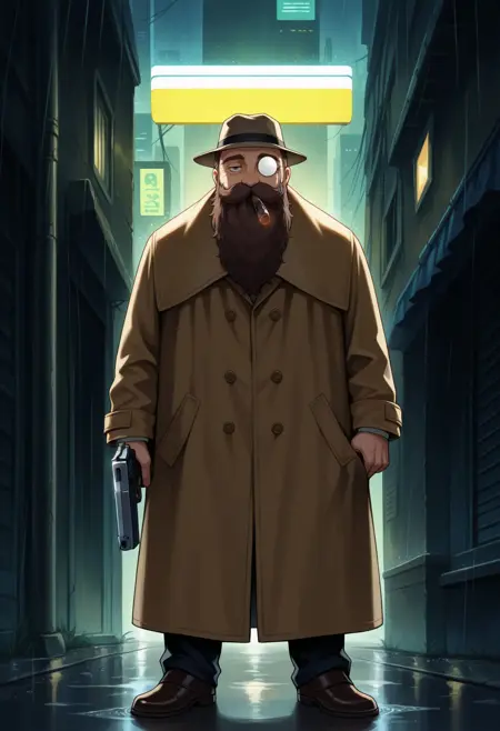 トリガー: 1boy, male focus, facial hair, brown hair, monocle, long beard, mustache, old man, thick eyebrows, thick mustache, beard, round eyewear, glasses