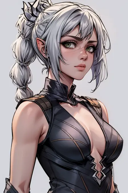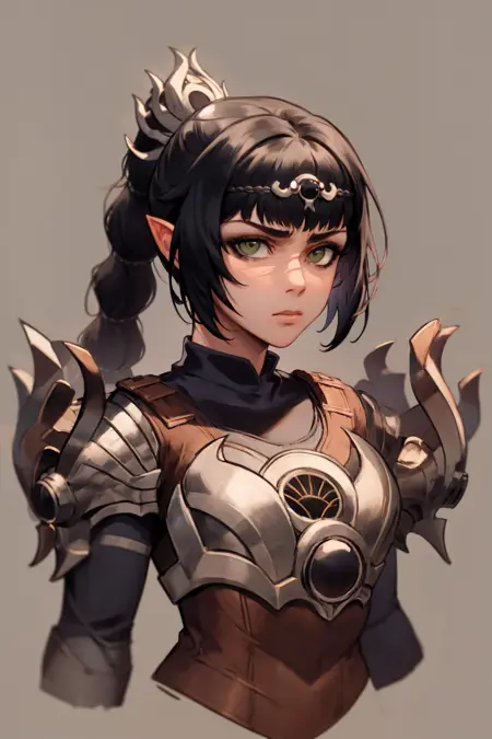 その他のプロンプト:1girl, long hair, braided ponytail, braid, green eyes, elf, pointy ears, armor, 3d render, realistic, blurry background