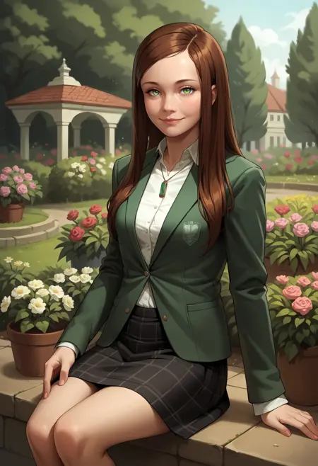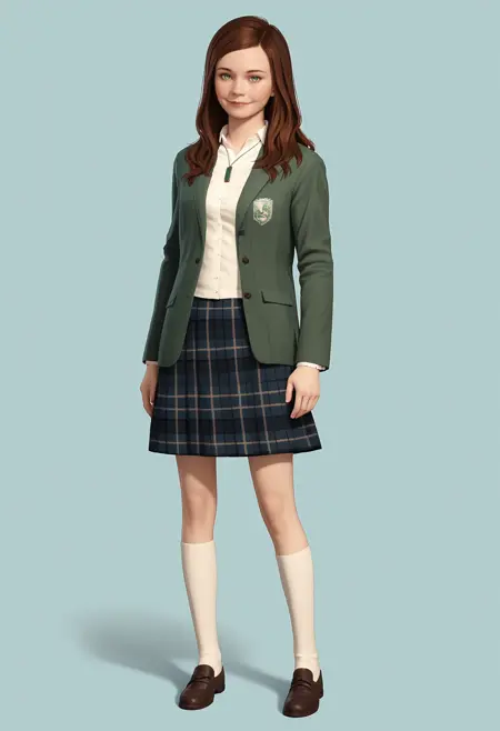 victoriaf,1girl, long hair, brown hair, green eyes, jacket, skirt, necklace, socks, shoes