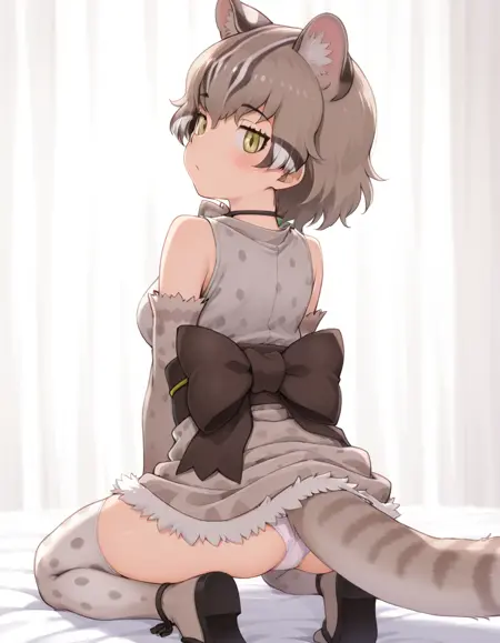 tsushima leopard cat \(kemono friends\), cat ears, animal ear fluff, yellow eyes, multicolored hair, brown hair, short hair, cat tail, animal print, leopard print, print bowtie, print kimono, sleeveless, sash, print skirt, back bow, fur-trimmed gloves, print gloves, elbow gloves, fur-trimmed skirt, thighhighs, print legwear, sandals