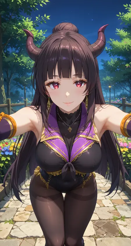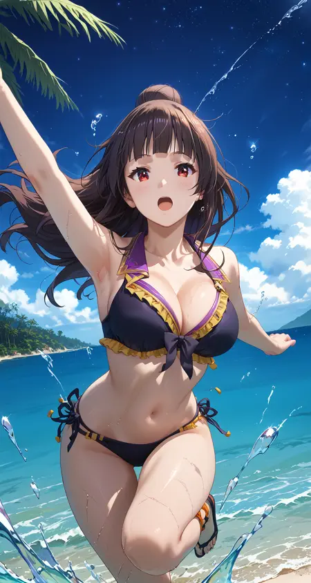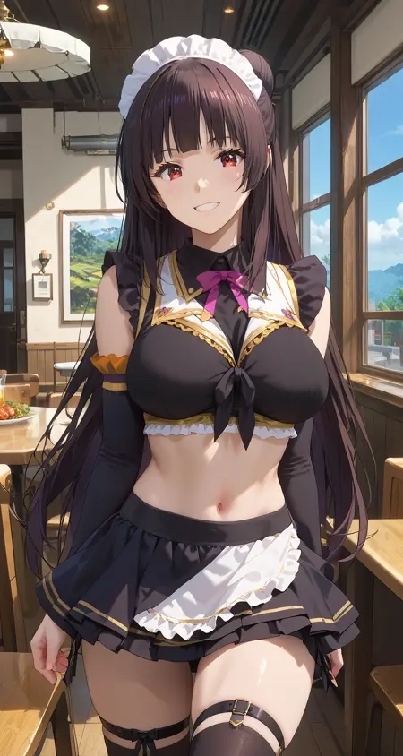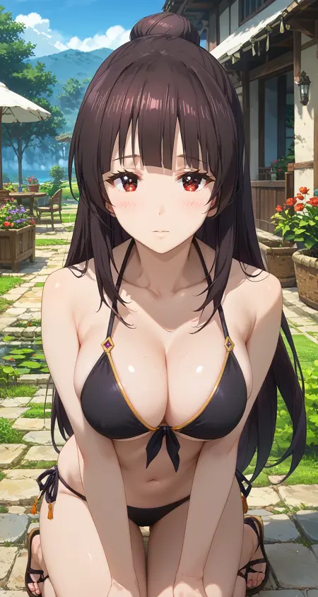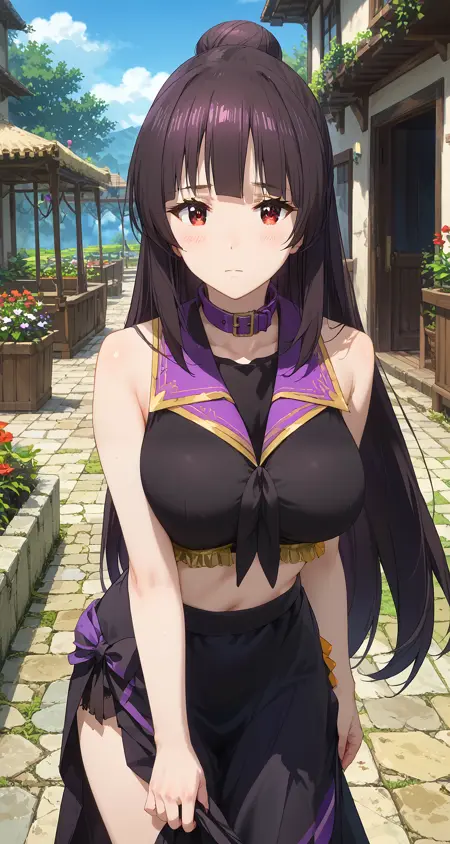 角色:konosuba_soketto,长发,黑发,刘海,发髻,红眼,大胸,