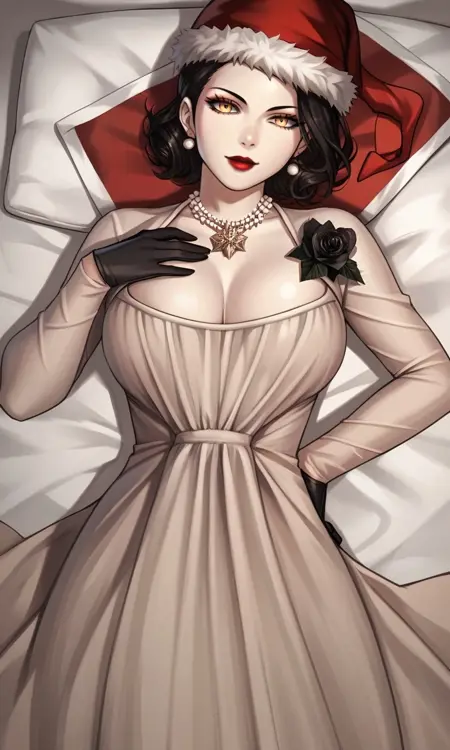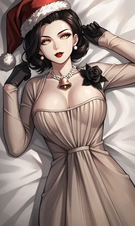 1girl,black hat,short hair,black hair,pale skin,vampire,yellow eyes,red lips,pearl earrings,pearl necklace,beige dress,long dress,long sleeves,flower brooch,black gloves