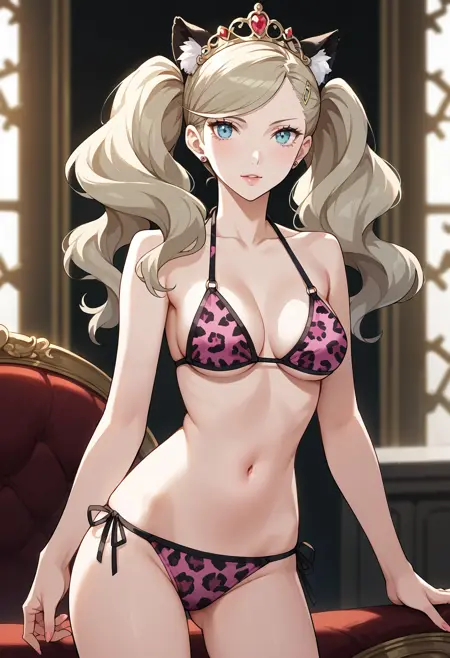 p5ann-cognitive, fake animal ears, cat ears, tiara, pink bikini, leopard print, side-tie bikini bottom