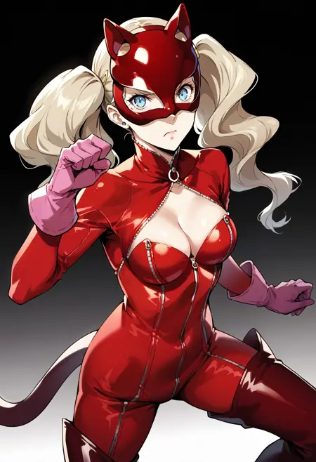 p5ann-panther, 红色紧身衣, 闪亮, 露胸剪裁, 猫脸面具, 假尾巴, 手套, 粉色手套, 大腿靴, 高筒袜,