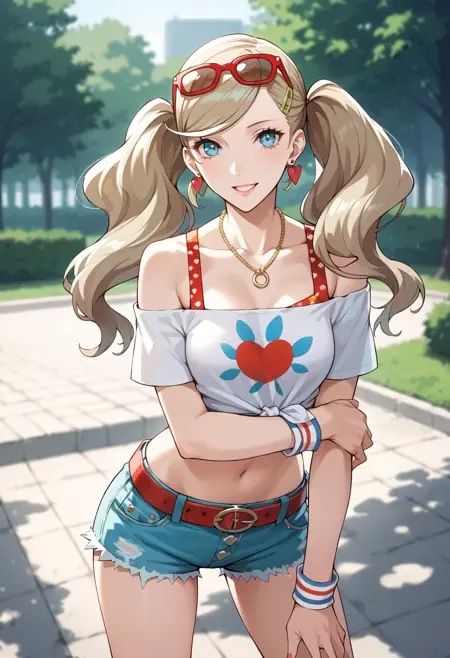 p5ann-strikers, eyewear on head, earrings, heart earrings, necklace, shirt, off shoulder, off-shoulder shirt, bare shoulders, graphic shirt, midriff, tied shirt, navel, short shorts, denim shorts, cutoffs, belt, red belt, wristband,