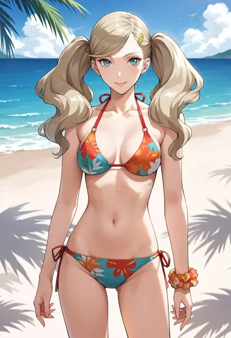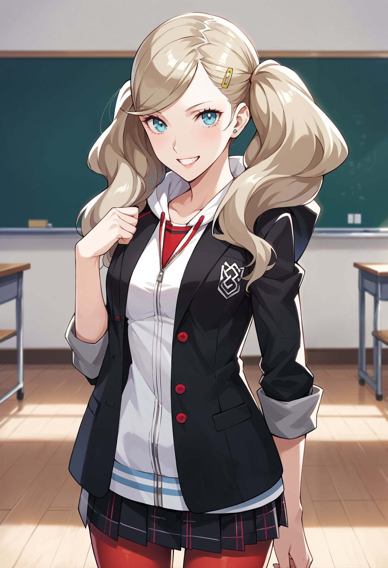p5ann, takamaki anne, blonde hair, long hair, twintails, swept bangs, hair clip,