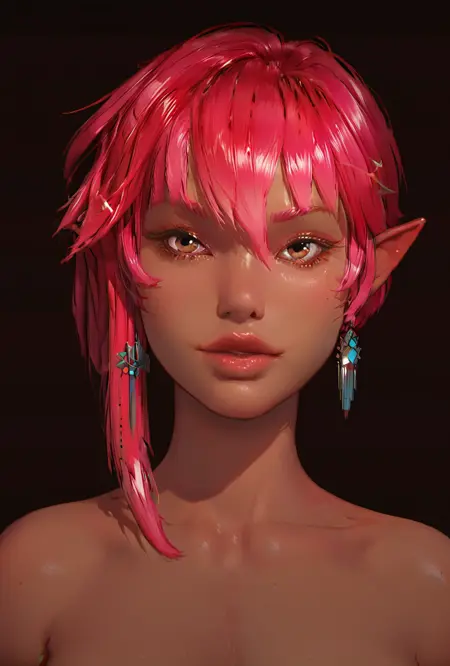 s3ra_3ros, 1girl, short hair, dark-skinned female, pointy ears, dark skin, tattoo, red hair, pink hair, lips, brown eyes, hair ornament,