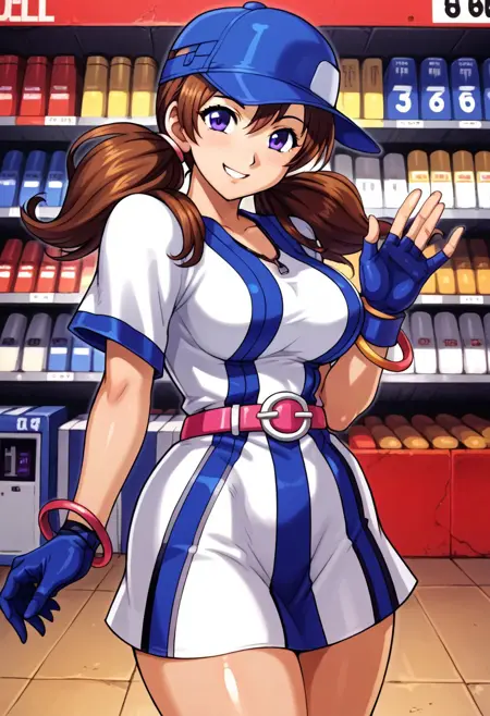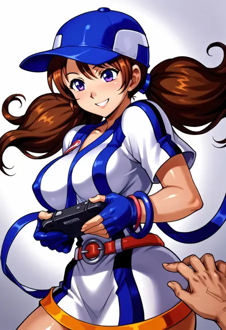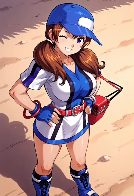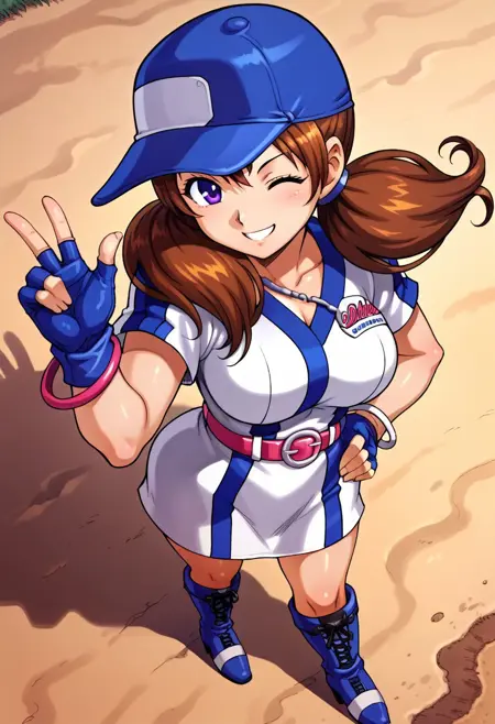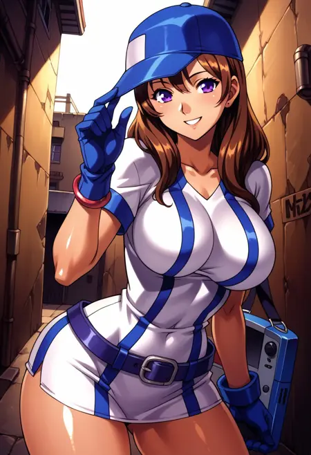 AiNeogeo,long hair,pigtails,brown hair,purple eyes,jewelry,bracelet, blue baseball hat,baseball uniform,short dress,belt,blue gloves,fingerles gloves
