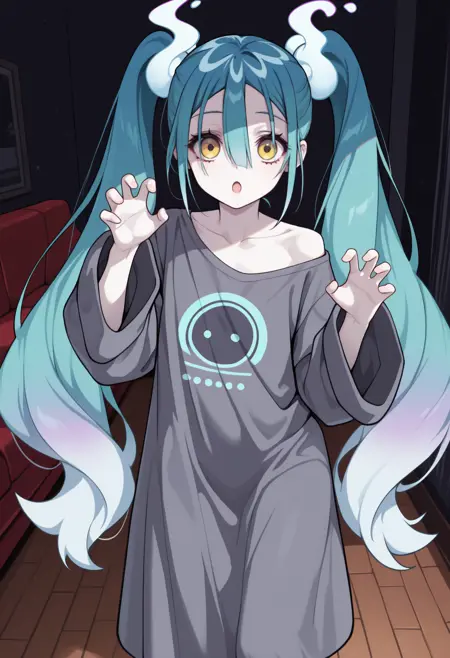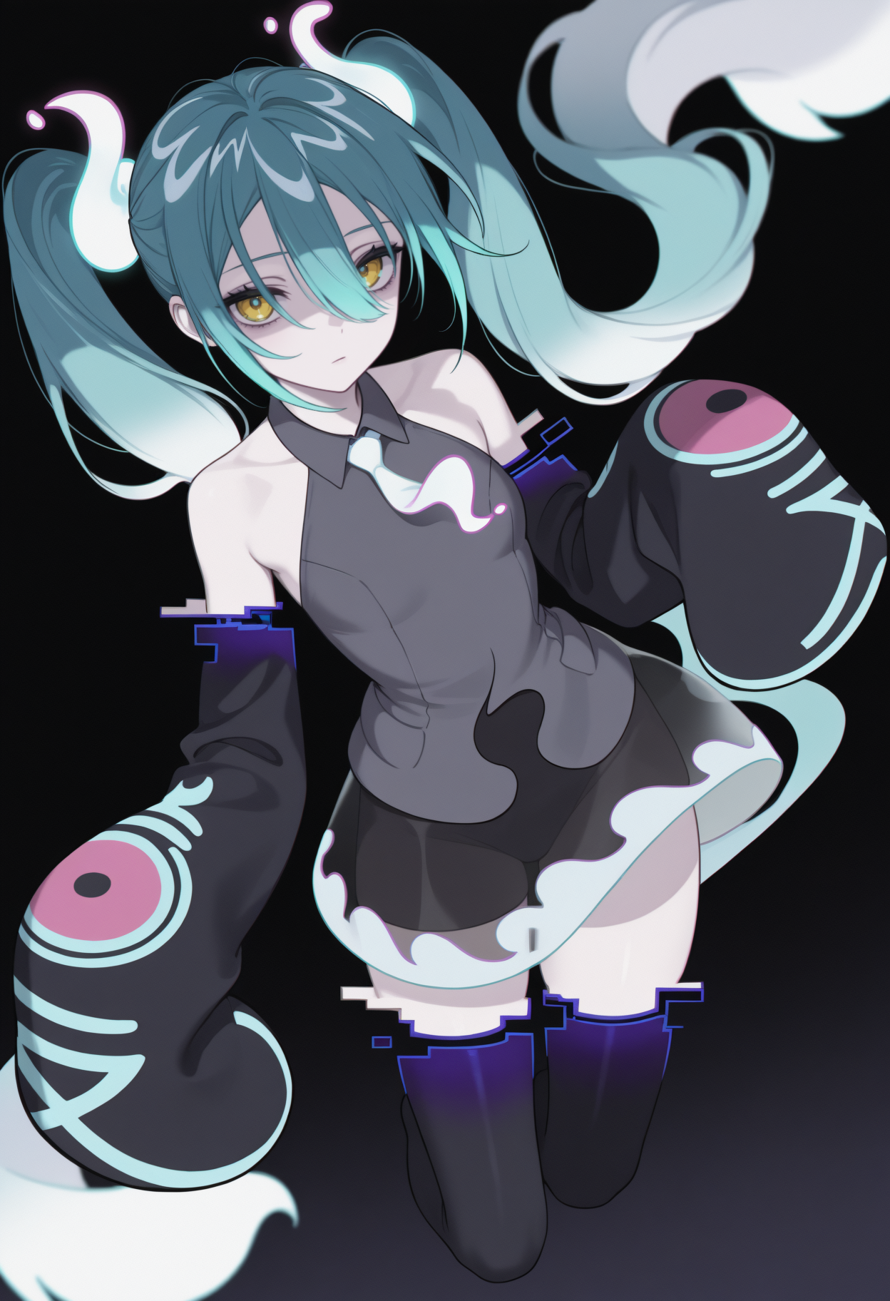 트리거 + 외모: gh0stmiku, 창백한 피부, 그라데이션 헤어, 청록색 헤어, 흰색 헤어, 눈 사이의 머리카락, 트윈테일, 노란색 눈