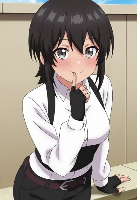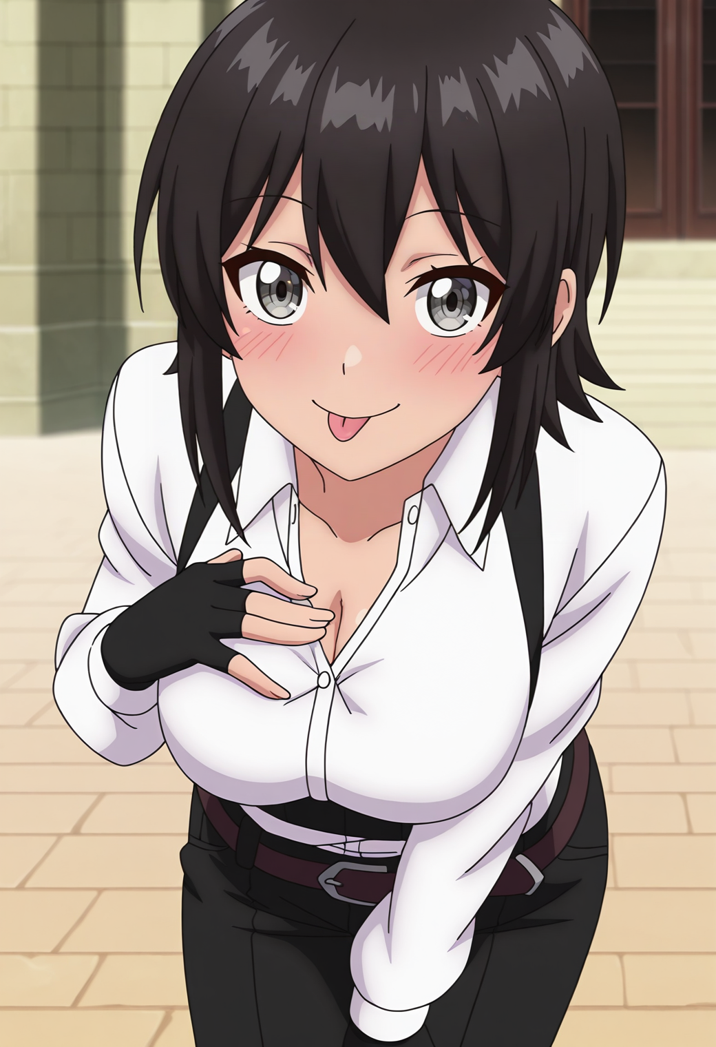 elnakakushi、灰色の目、中程度の胸、シャツ、黒いベスト、黒い手袋、フィンガーレスグローブ、ベルト、黒いズボン,