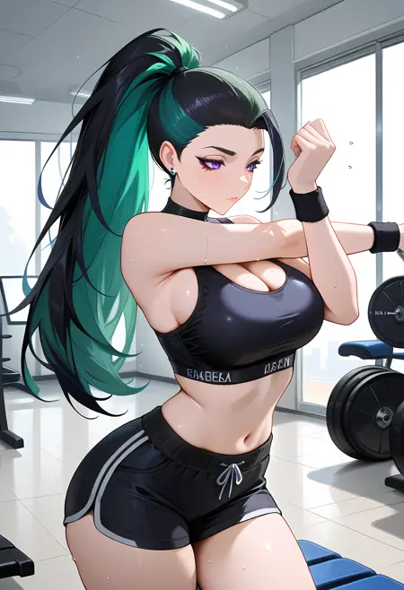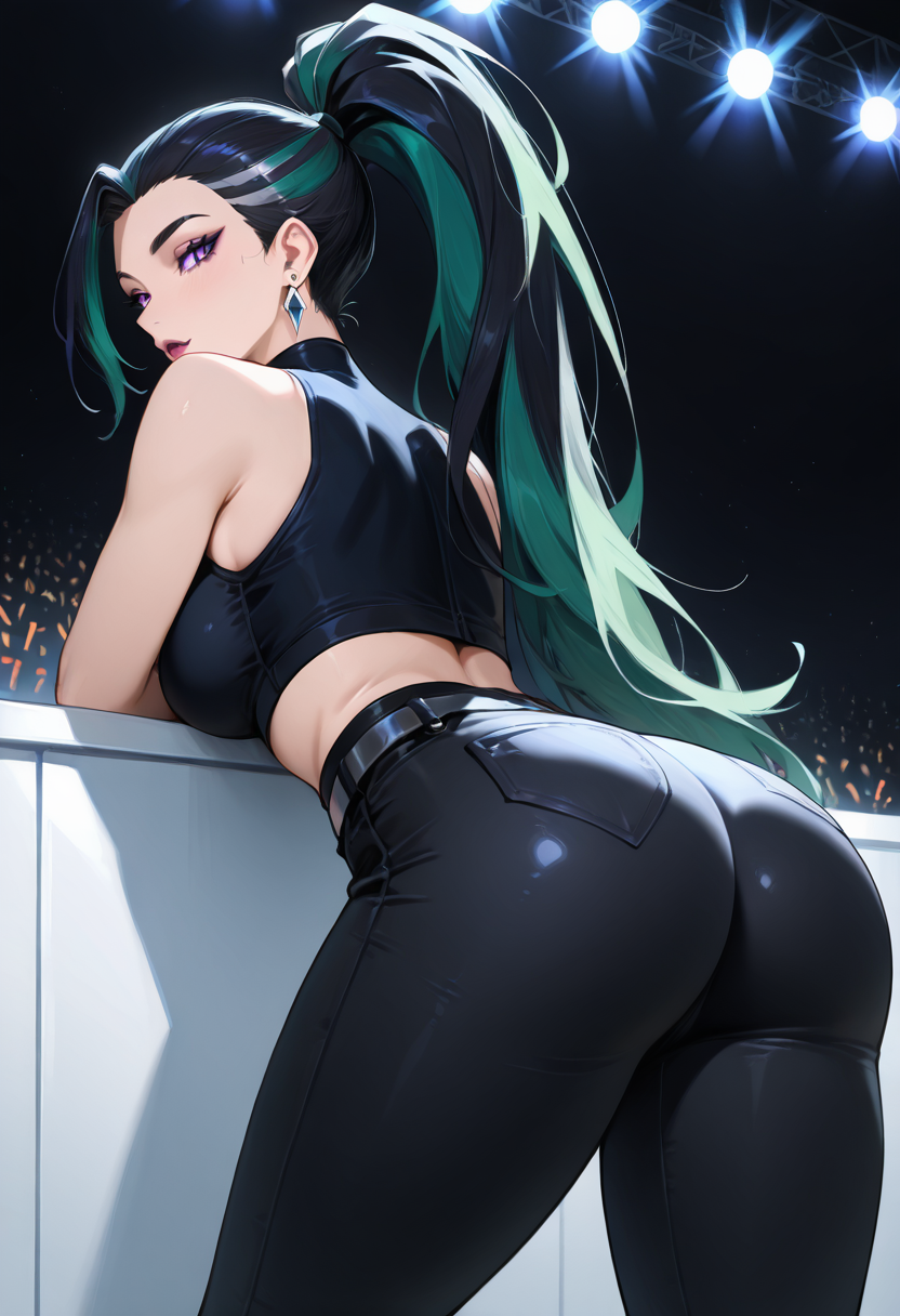 kaisabaddestxl, 귀걸이, 보석, 재킷, 폰테일, 긴 머리, 보라색 눈, 어깨 드러냄, 크롭탑, 다색 머리, (녹색 머리:1.1), 검은 머리, 검은 타이트 팬츠, 드러난 어깨, 넓은 골반,