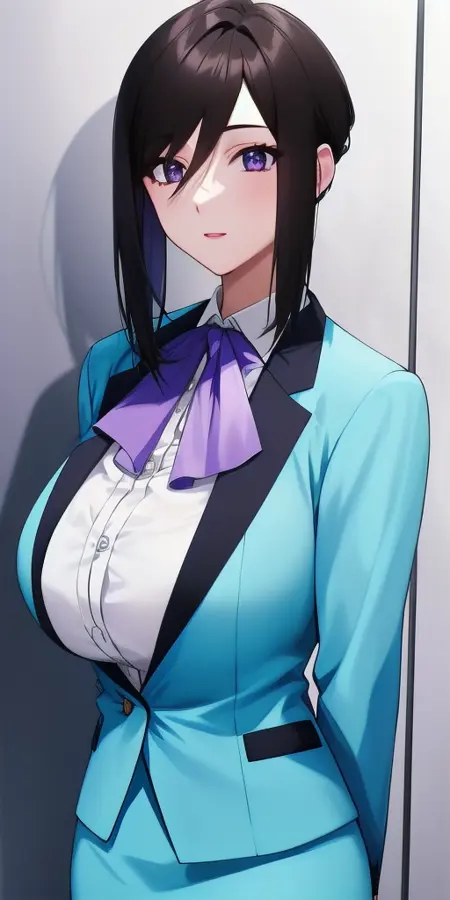 white_collared_shirt_purple_ascot_aqua_pencil_skirt_aqua_blazer:オフィスレディとしての普段の仕事着。