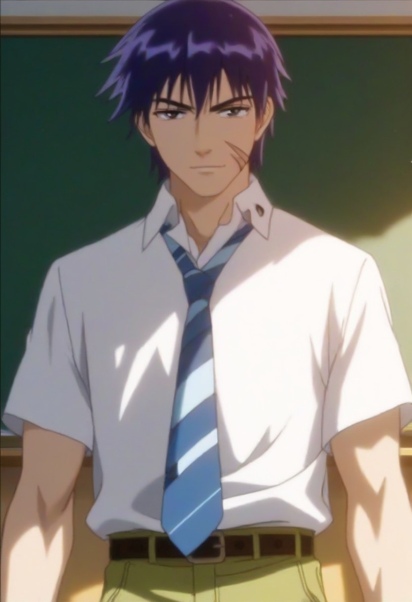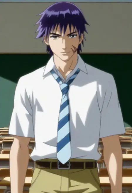 Hisaya Miki, purple-black hair, black-gray eyes, moles under eyes, face scars, white collared shirt, striped necktie, belt, green pants