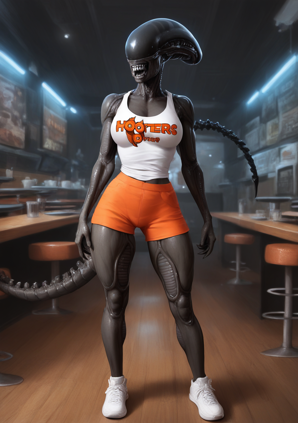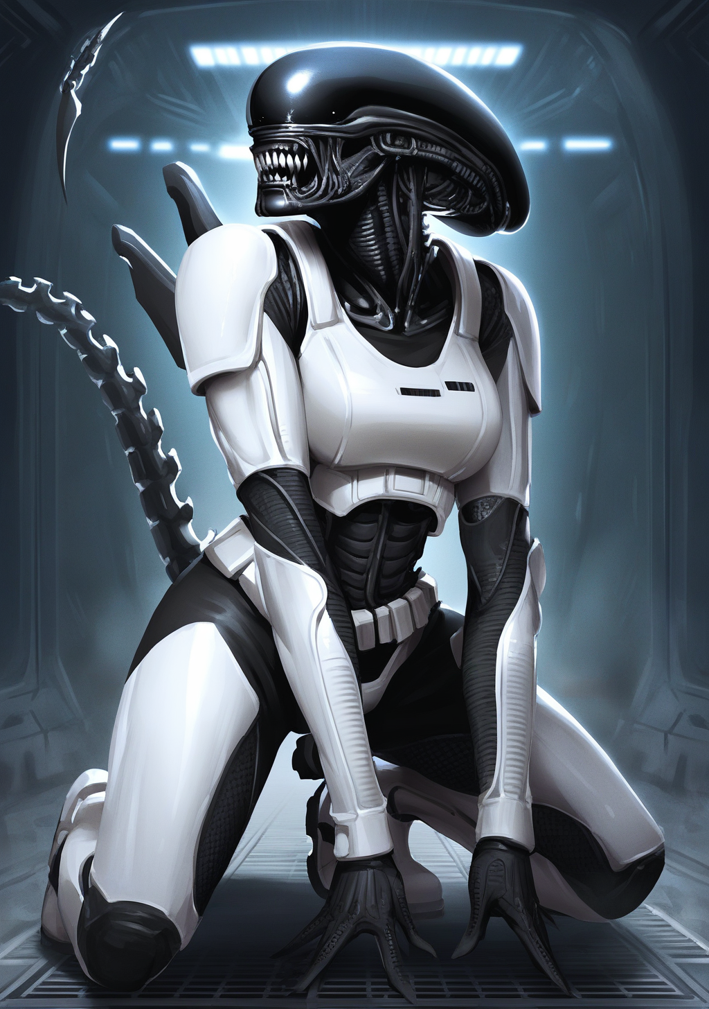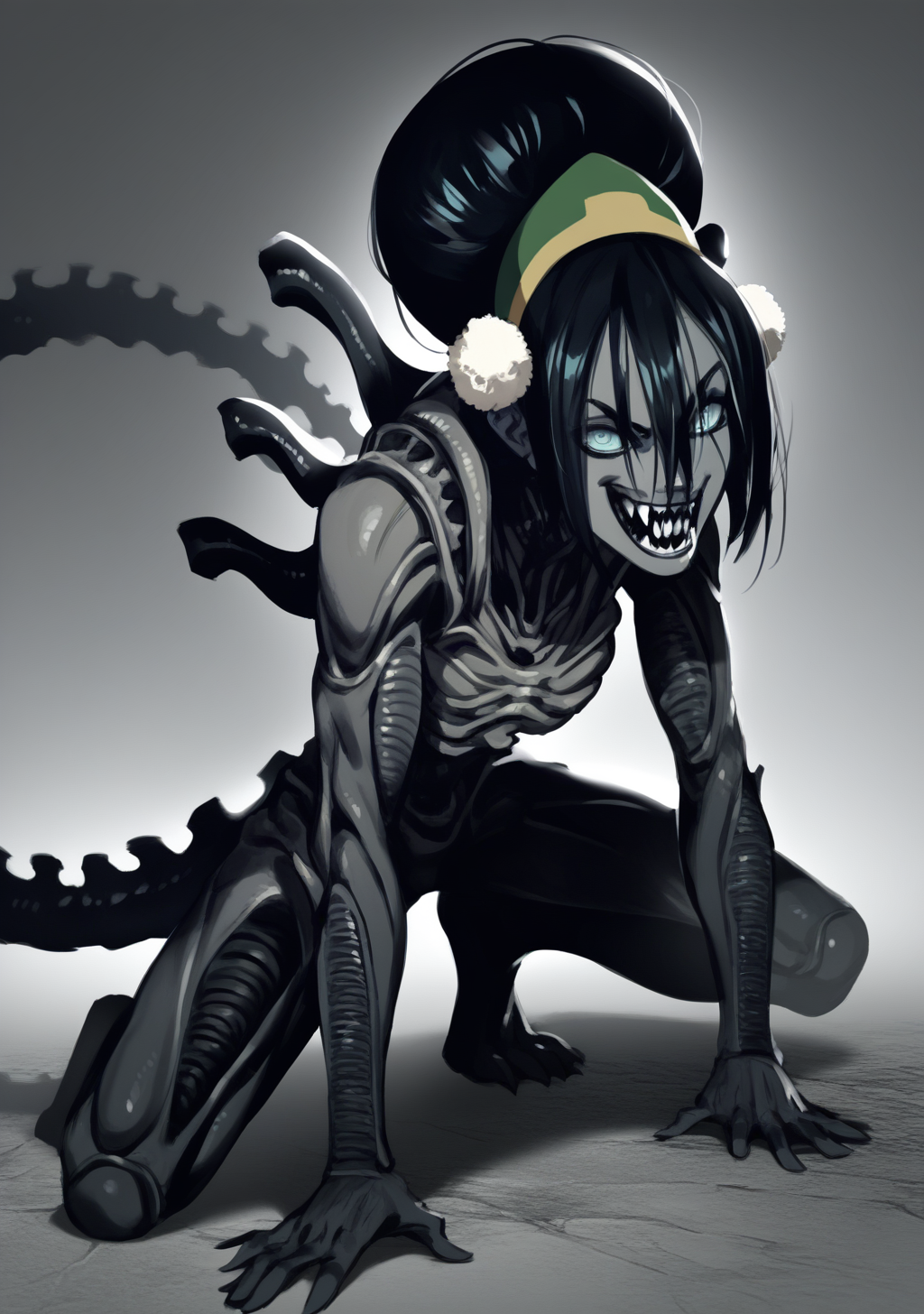 프롬프트: zenomorphification, zenomorph, 큰 머리, 긴 머리, 검은 피부, 외계인, 날카로운 이빨