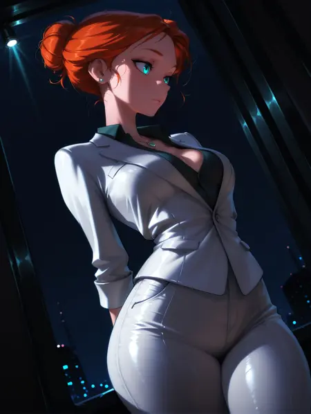 衣装プロンプト: necklace, earrings, formal, suit, shirt, white pants, pants, white jacket