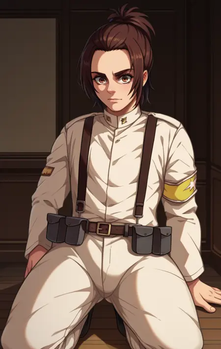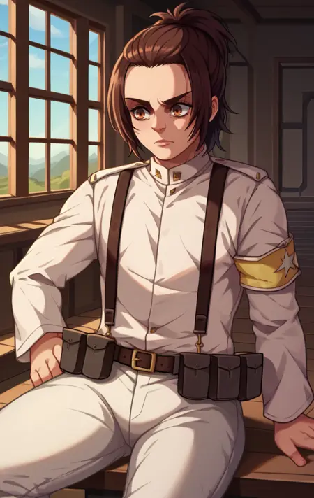 GabiBraunMArlo,1girl,brown hair,brown eyes,ponytail,belt,uniform,military,military uniform,suspenders,armband,pouch,white pants