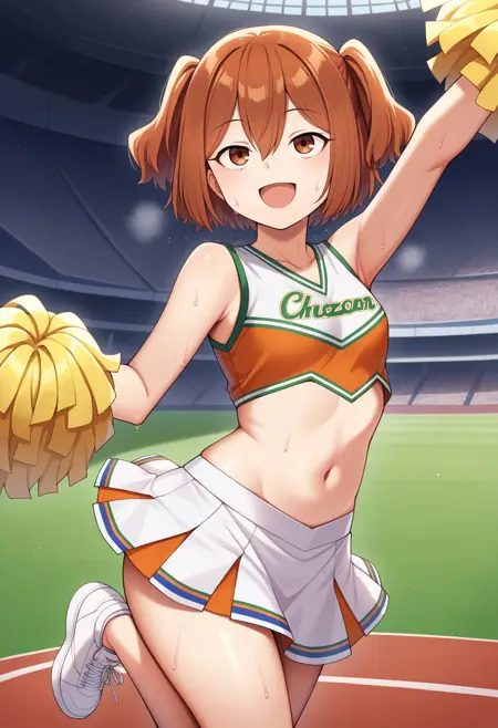 Trigger: kanne, 1girl, short hair, two side up brown eyes, brown hair, hair between eyes, shoulder cutout, white shirt, clothing cutout, midriff, two side up, navel, short shorts, green shorts, white belt, white thighhighs, bare shoulders