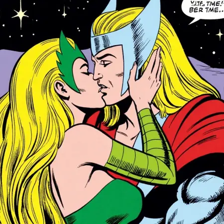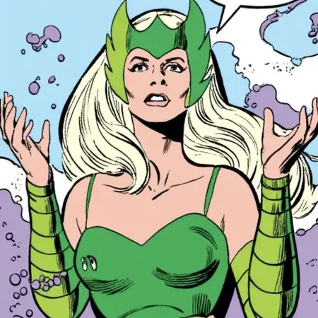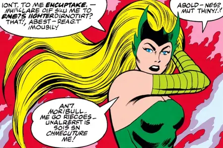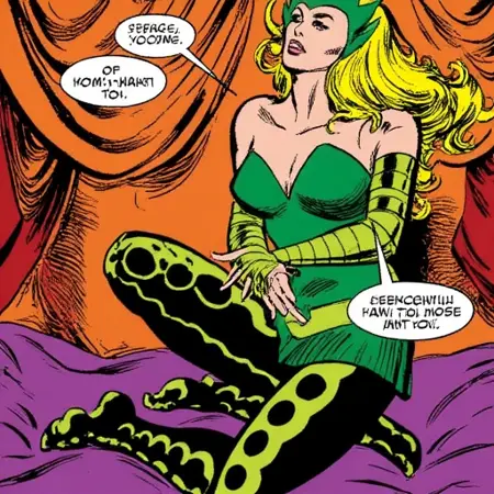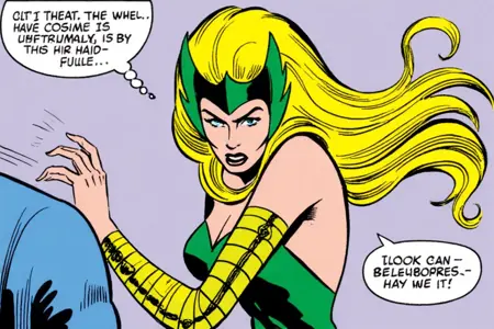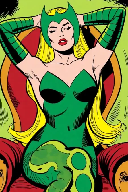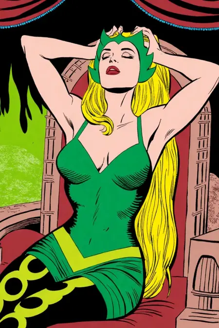 魔女アモラは、クラシックなコミックブックスタイルで描かれています。