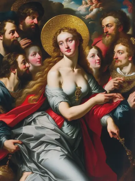 루벤스의 작품들은 종종 호화로움과 위엄을 전달하며, 부유한 후원자들의 미적 취향을 반영했다. 그의 스타일은 역동적인 구도, 휘몰아치는 옷자락, 그리고 인간 신체의 감각적 아름다움을 찬양하는 바로크적 활력으로 특징지어졌다.