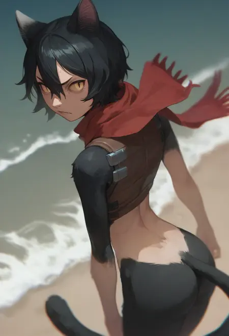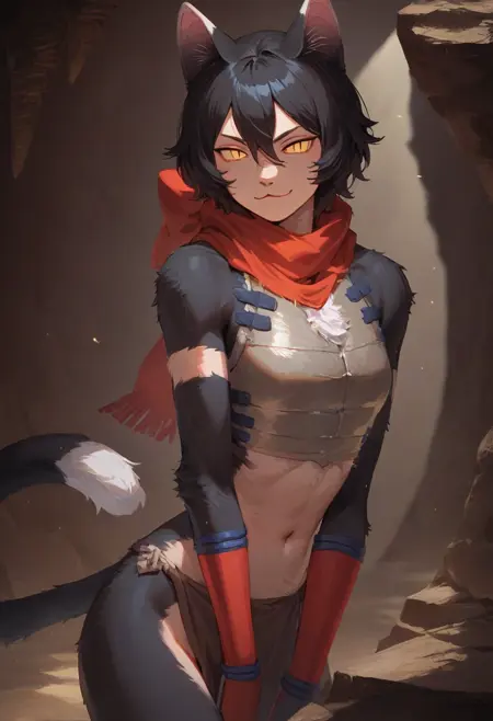 izutsumi, 1girl, cat girl, animal ears, short hair, black hair, yellow eyes, red scarf, cat tail, hair between eyes, navel, slit pupils, loincloth, (fur:1.5), textured fur,
