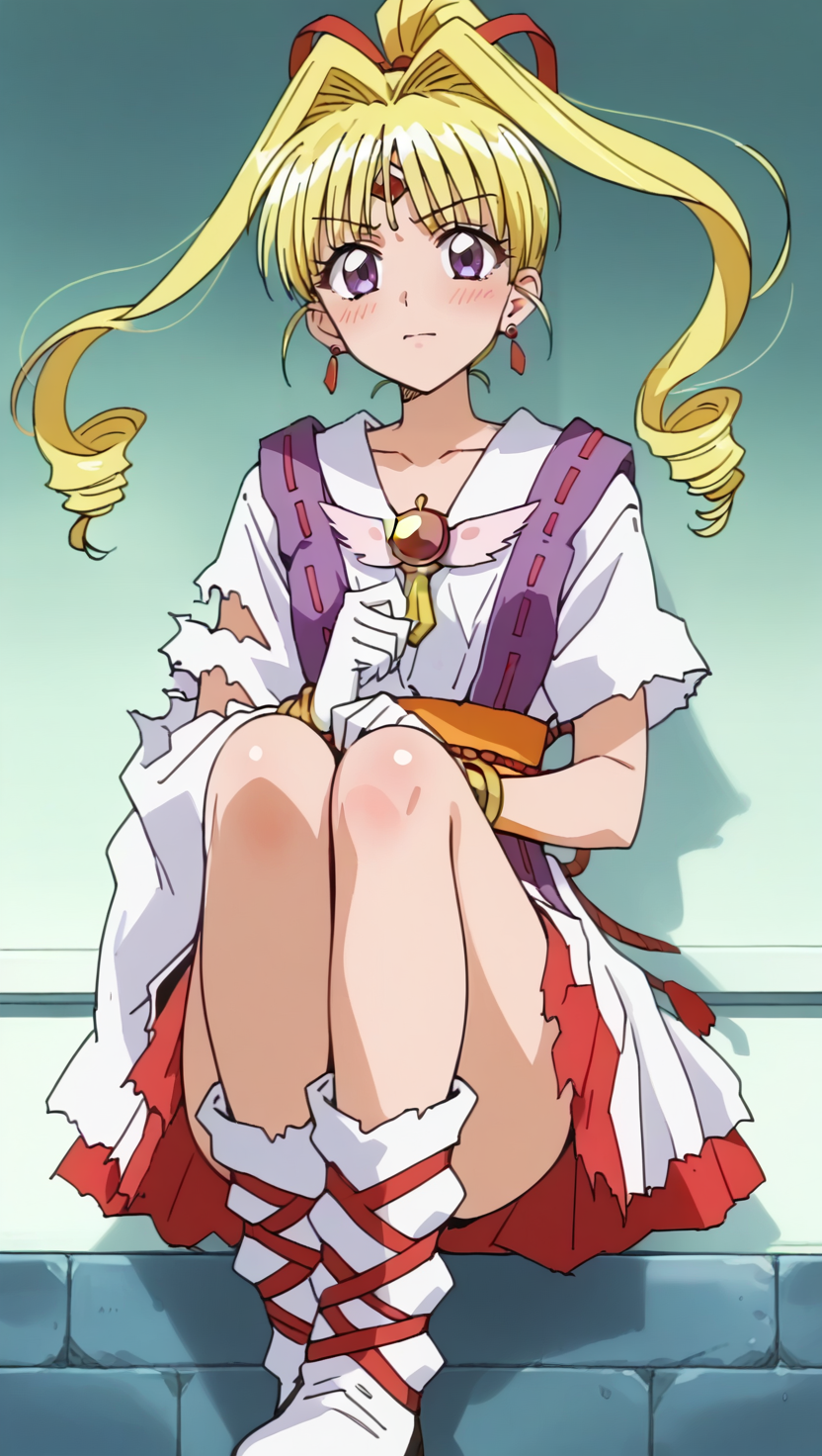 Trigger words for ep19 version: KKJ, (Artist A Style:1.3), forehead jewelry, purple eyes, blonde hair, hair intakes with drill long sidelocks, very long hair, one high drill ponytail at the back, red hair ribbon, earrings, torn white kimono, torn white layered kimono miniskirt with red under layer, 2 torn purple straps on torn layered kimono miniskirt, 2 torn purple straps, pink gem on chest, torn white wide sleeve on the right arm, torn white short sleeve on the left arm, left sleeve completely torn, gold bracelet, white gloves, orange obi, red obijime cord, bow-shaped knot on waist with tassels, torn white boots, red crisscross ribbons wrapping around boots
