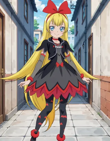 score_9, score_8_up, score_7_up, anime screencap, 1girl, solo, regina, bat print, pantyhose, blue eyes, choker, bow, cropped jacket, hair bow, print legwear, red ribbon, dress, red bow, hairband, lora:regina:0.8