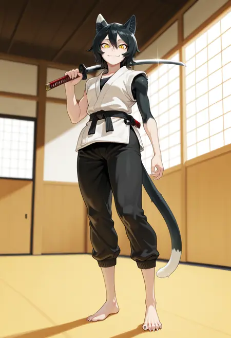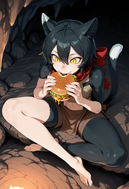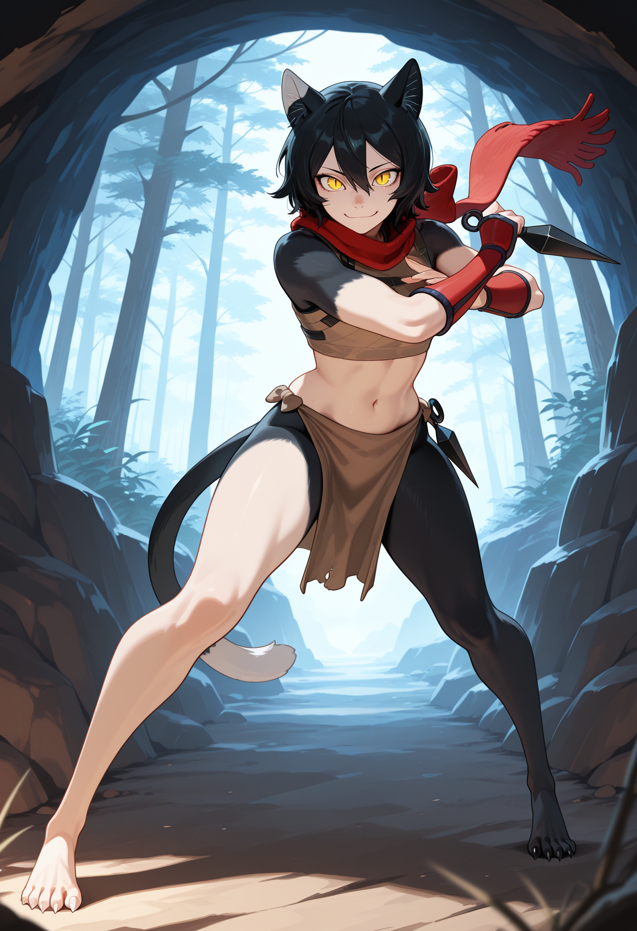 izutsumi, cat girl, short black hair, yellow eyes, slit pupils, furry female, black body fur, barefoot, sharp toenails, black nail polish, brown crop top, loincloth, red scarf