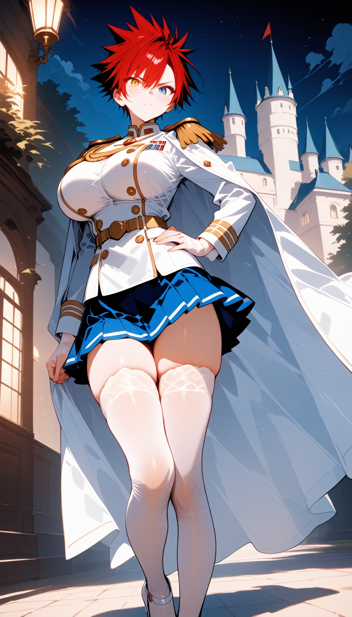 tomboy, very short hair, red hair, spiked hair, very handsome face, heterochromia, blue eyes, yellow eyes, large breasts
