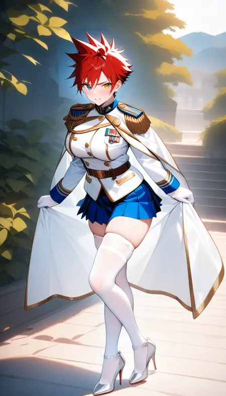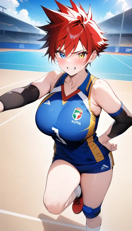 a adult tomboy girl with very boyish handsome shortcut red hair with (spiked hair:1.2) and very handsome face and heterochromia with blue eyes and yellow eyes and perfect female body and large breasts