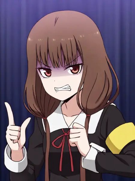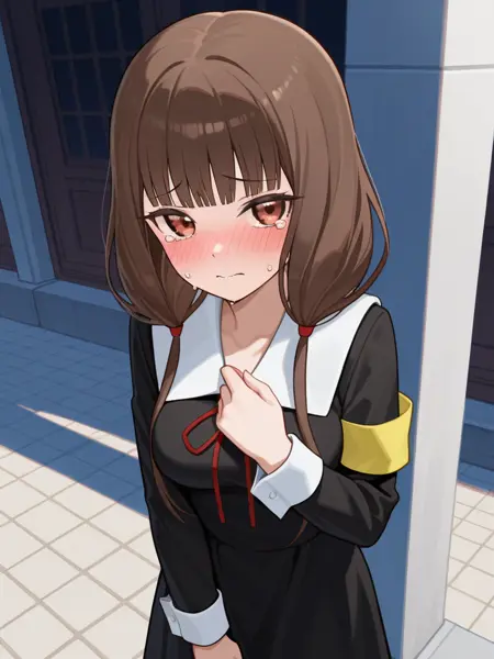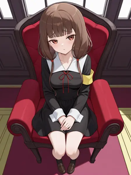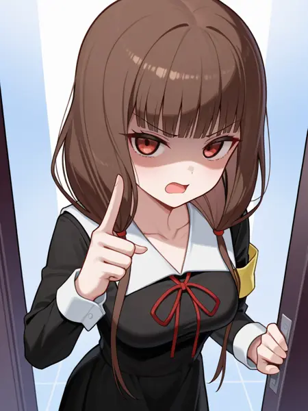 이노 미코, 긴 머리, 트윈테일, 앞머리, 학교 uniform, 슈치인 학교 유니폼, 검은 드레스, 긴 소매, 검은 소매, 목에 끈, 빨간 리본, 노란 팔찌, 검은 팬티스타킹