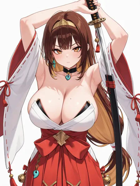 saya, 1girl, 单人, 长发, 棕发, 发饰, 中等胸部, 黄色眼睛, 日式服装, 项圈, 和服, 胎记, 橙色眼睛, 黑色项圈, 胸部胎记, 白色和服
