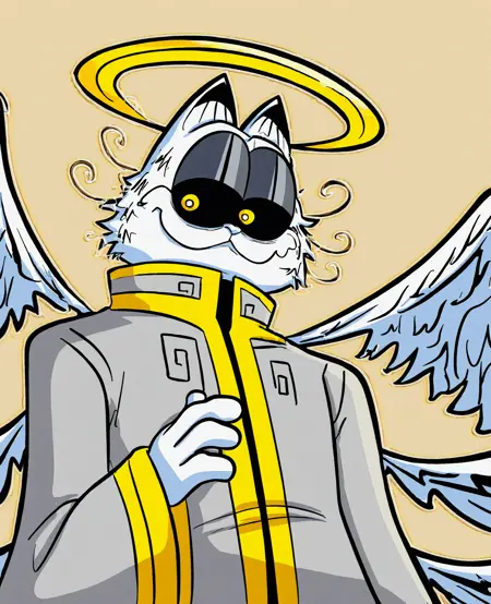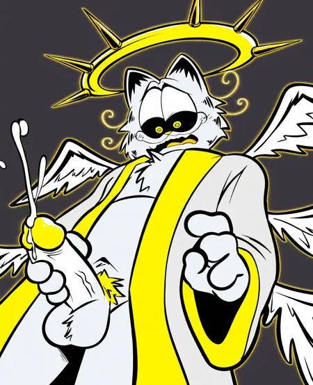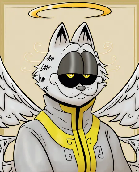 1boy, godfield, garfield_\(series\), black sclera, yellow eyes, halo, white fur, wings, white wings, yellow accents