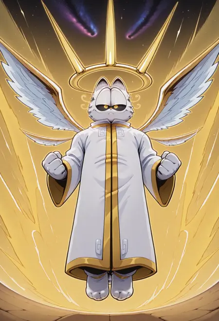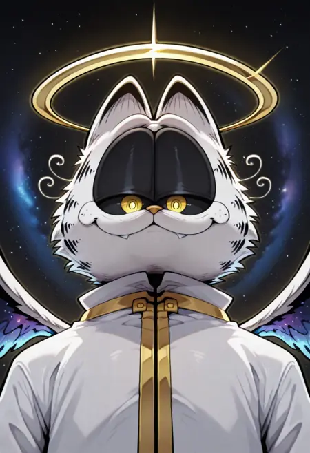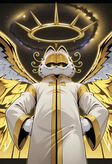 1boy, godfield, garfield_\(series\), black sclera, yellow eyes, halo, white fur, wings, white wings, yellow accents