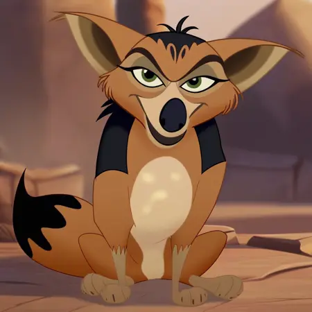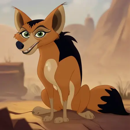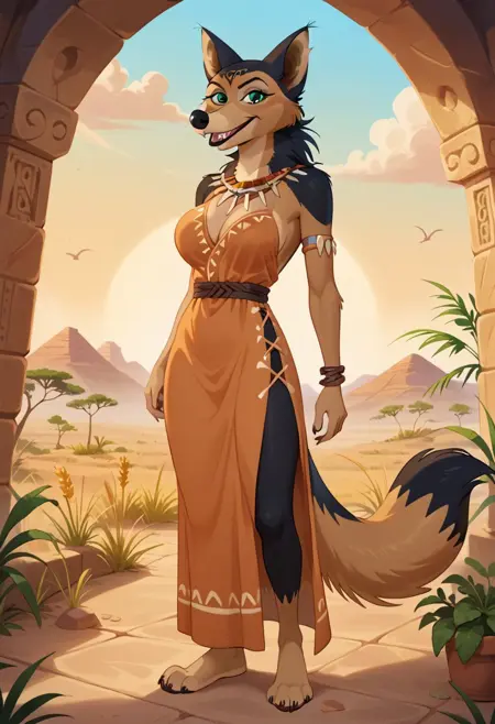 jackal, canine, brown and black fur, tan paws, tan belly, tan muzzle, black nose, dipstick tail, dark green eyes,