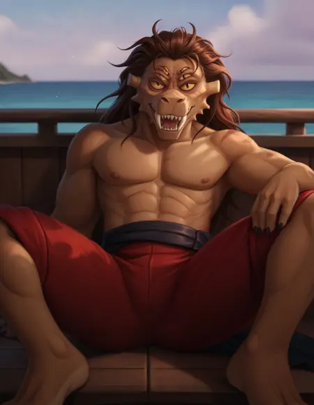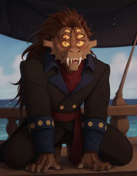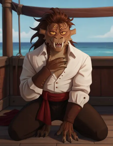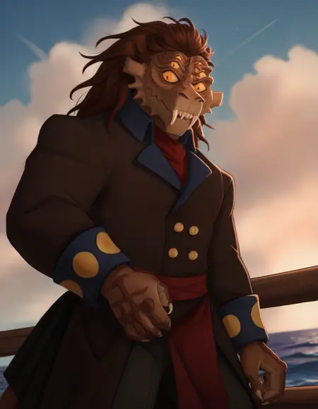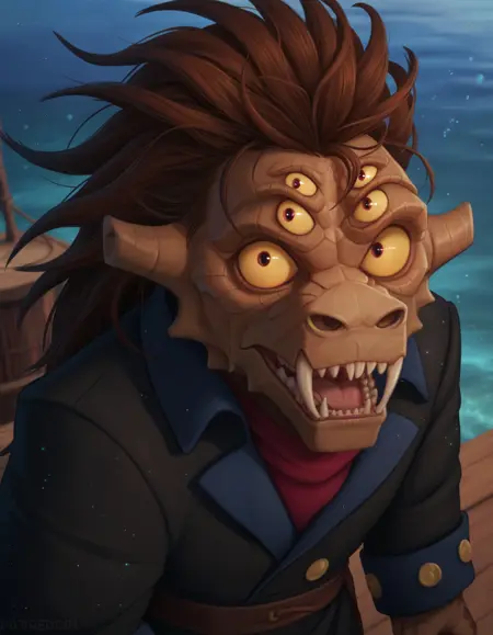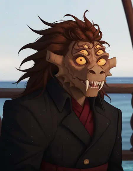 Prompt: nathan1el_fl1nt, anthro, scalie, scaly body, detailed scales, yellow sclera, solo, extra eyes, multi eye, male, 1boy, colored sclera, male focus, hair, clothing, brown hair