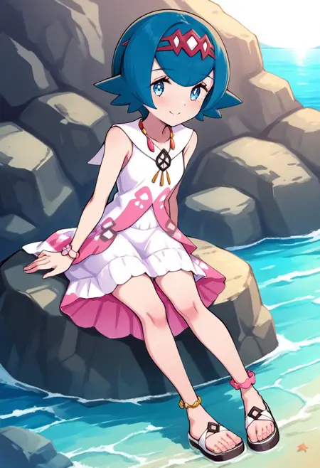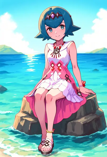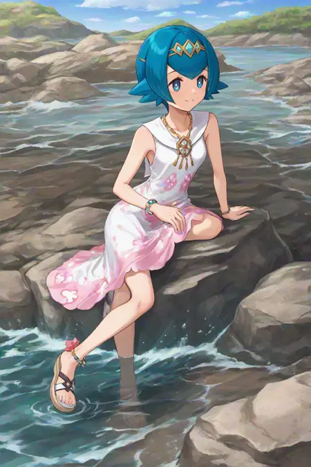 syglana, [lana_\(pokemon\)], short_hair, blue_hair, hairband, sleeveless_dress, white_dress, [pink_dress] bracelet, jewelry, necklace, anklets, sandals, toes, official_alternate_costume