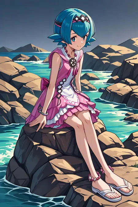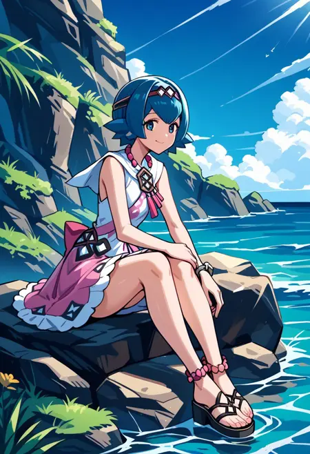 syglana, short_hair, blue_hair, hairband, sleeveless_dress, white_dress, [pink_dress], bracelet, jewelry, necklace, anklets, sandals, toes