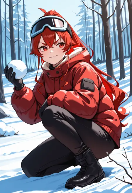 트리거 + 외모: er1s, 긴 머리, 빨간 머리, 눈 사이의 머리카락, 아호게, 교차한 앞머리, 옆머리, 빨간 눈, 두꺼운 눈썹
