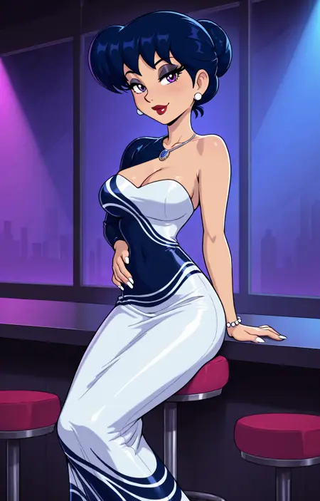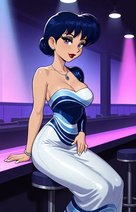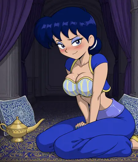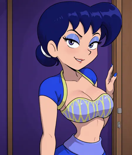 aracelli, toon (style), flat color,blue hair, hair bun, aracelis_haremoutfit, harem outfit,dark blue eyes, large breasts, blue glitter eyeshadow,