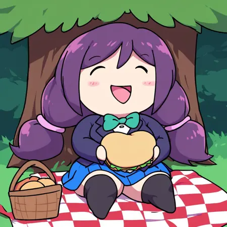 役立つタグ: smol nozomi, chibi, 紫髪, ツインテール, ネイビーのブレザー, 青いスカート, シャツ丈靴下, ストッキング, 白シャツ, 白いアンダーシャツ, 緑のボウタイ, ピンクのスクランチ, 簡素な顔, 小柄, ストックサイズ
