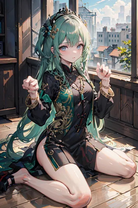 qu,multicolored hair,black and green hair,long hair,hair ornament,tiara,chinese clothes,long sleeves,bracelet,necklace,ribbon,black footwear
