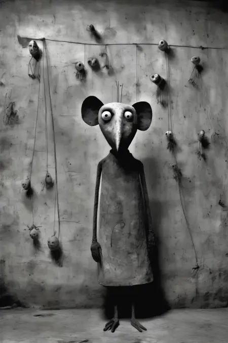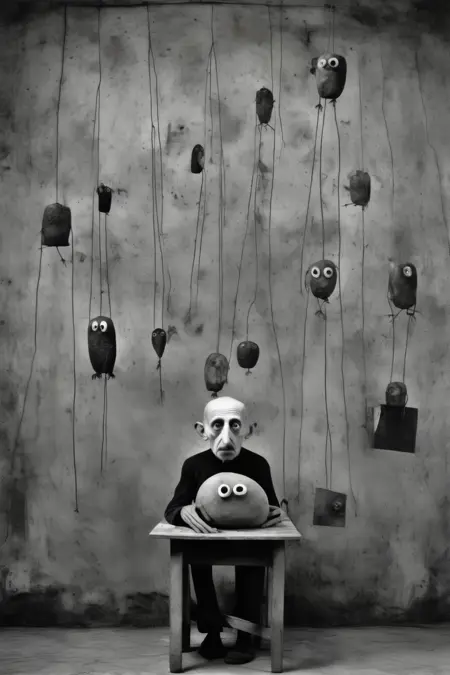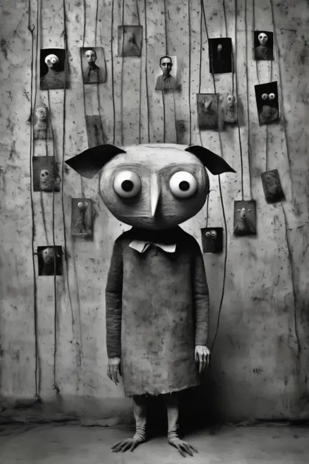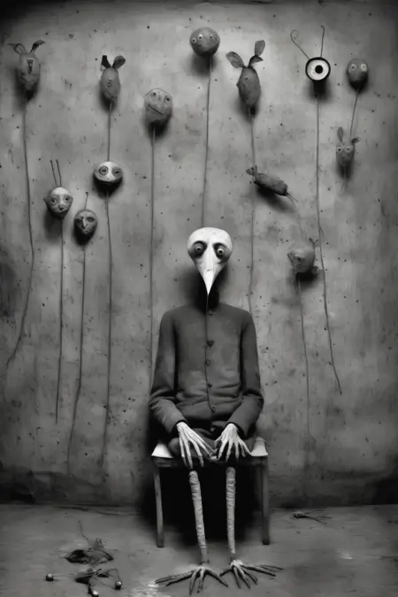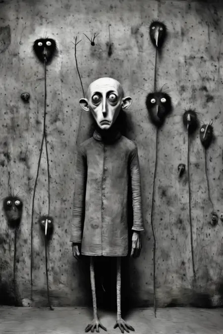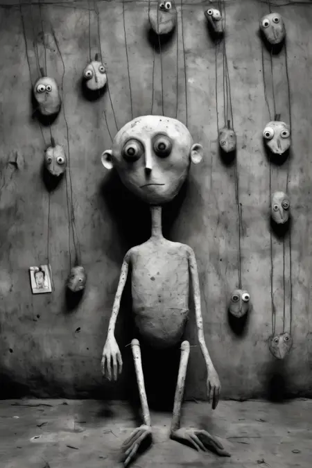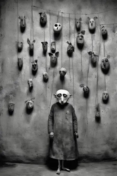 拜伦的摄影作品常以超现实且令人不安的特质为标志。他通过扭曲的人物、非传统的场景和象征性物件构建构图,挑战传统的美学观念,唤起不安与内省之感。