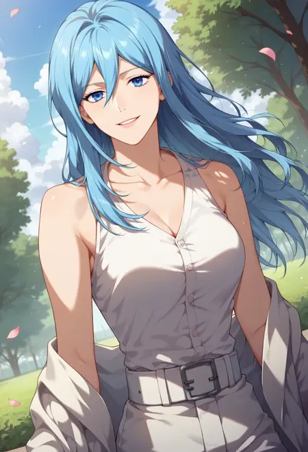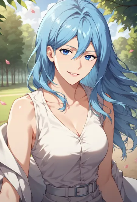 캐릭터 프롬프트: 스카야킬릴랜드, 연한 아쿠아 머리카락, 긴 머리, 파란 눈, 아쿠아 머리카락, 눈 사이의 머리카락