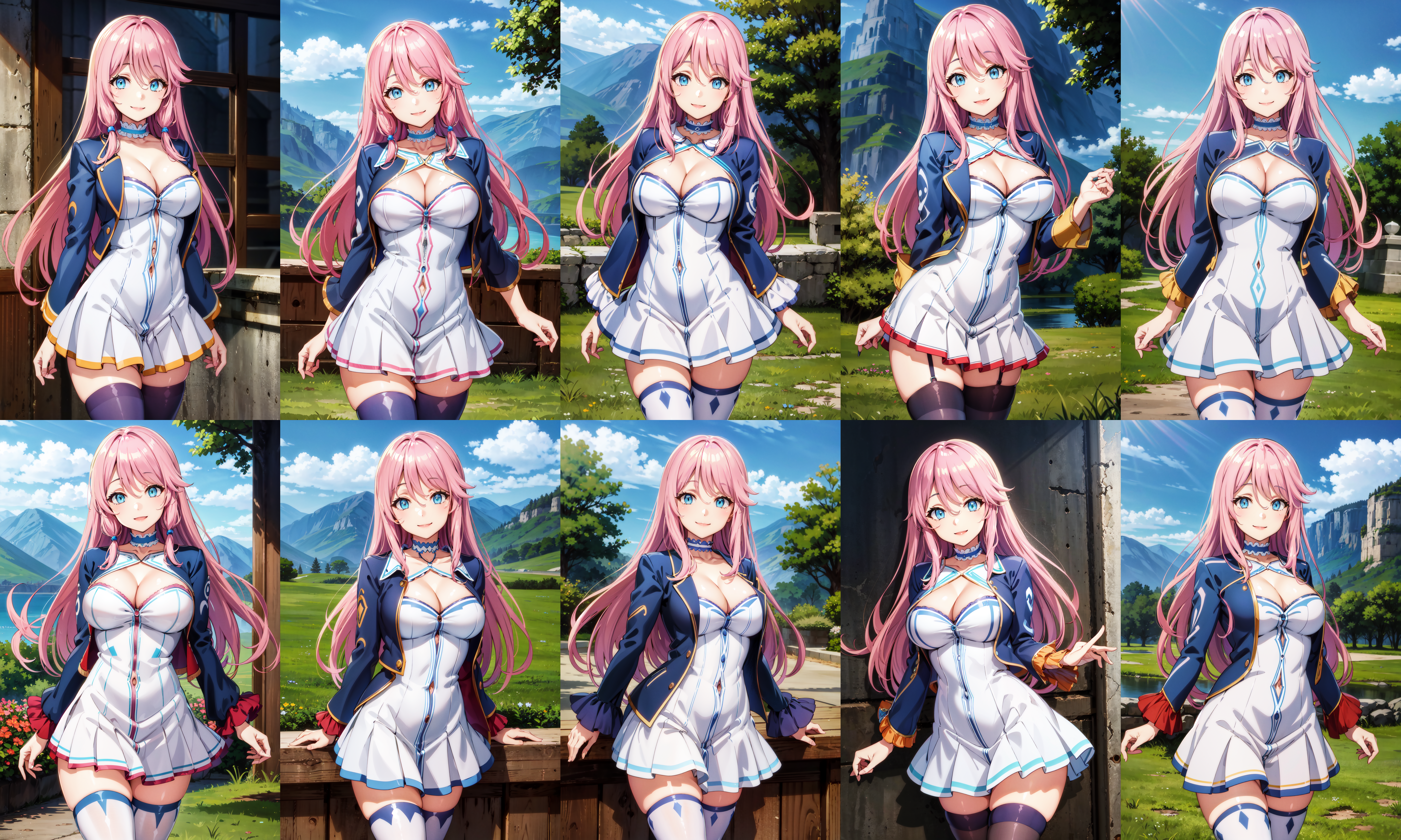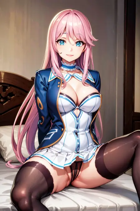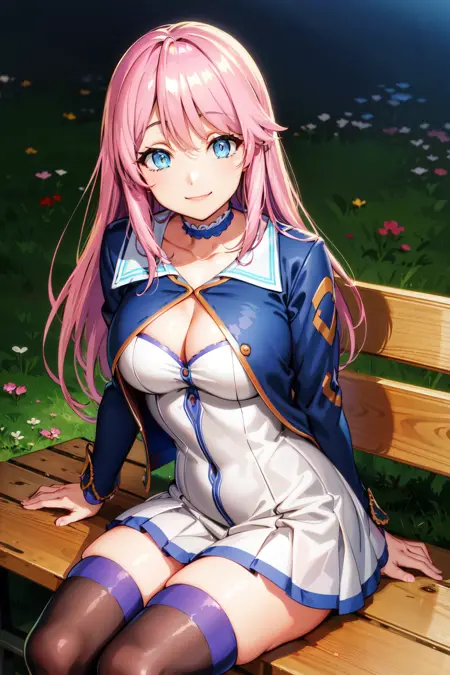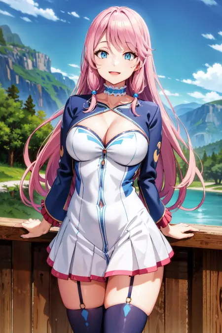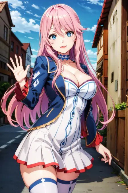 衣装2aaflare, long hair, blue eyes, thighhighs, dress, choker, blue jacket, cleavage cutout