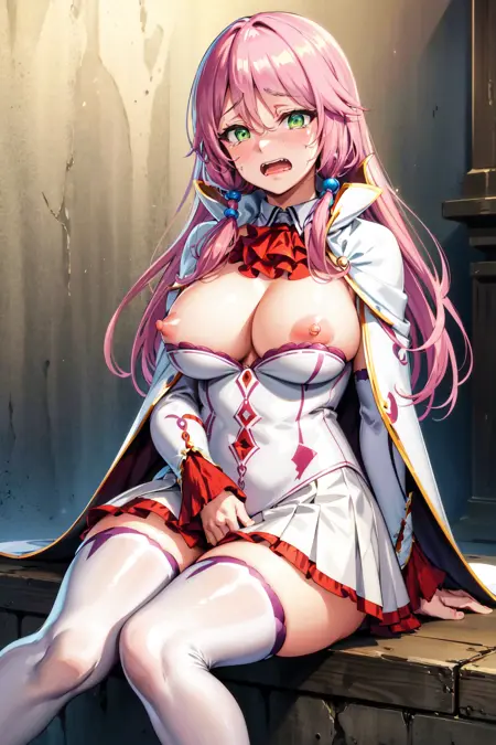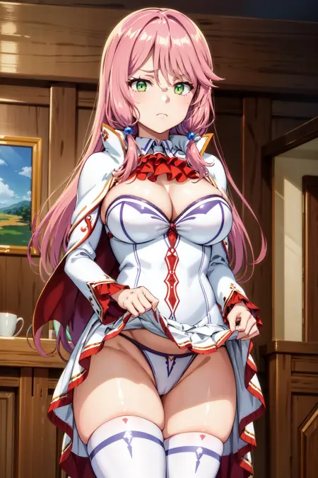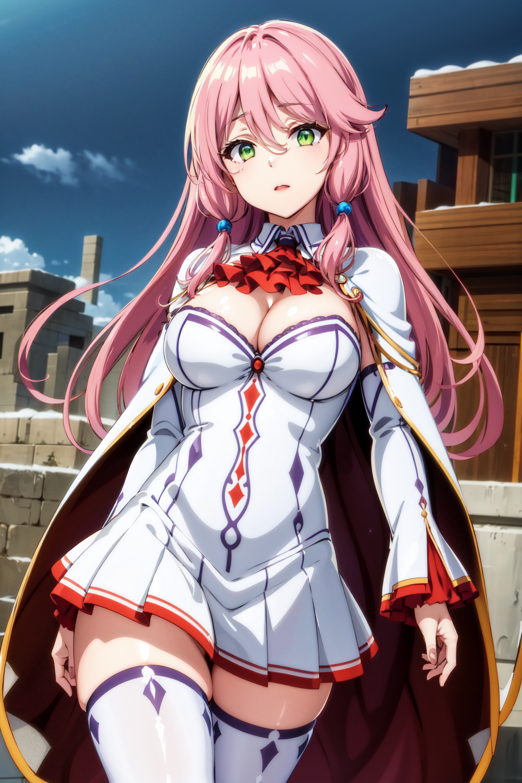 衣装1aaflare, long hair, hair bobbles, bangs, green eyes, red ascot, white capelet, cleavage, white dress, long sleeves, white thighhighs