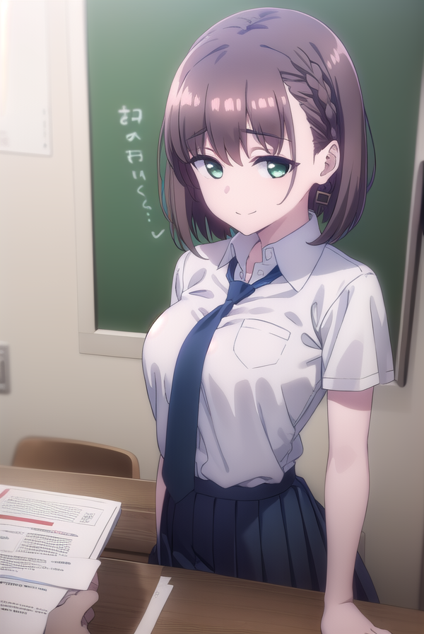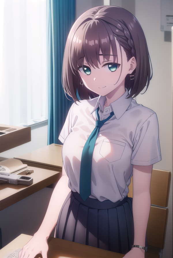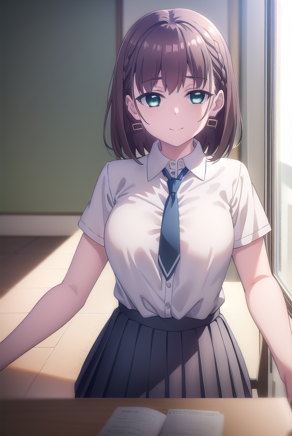 aichan, blue eyes, brown hair, short hair, side braid, braid, hair ornament, hairclip,