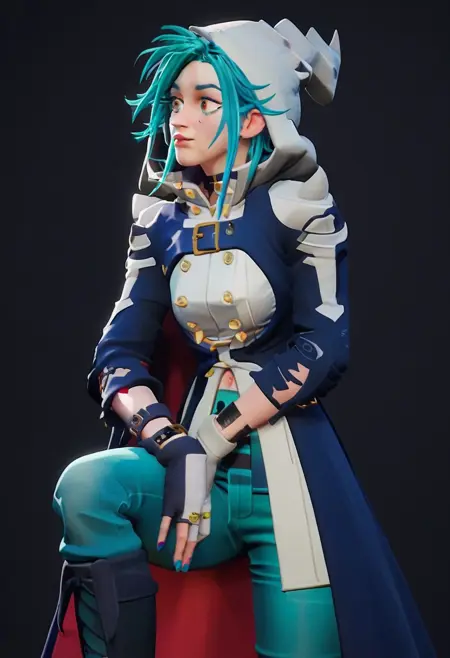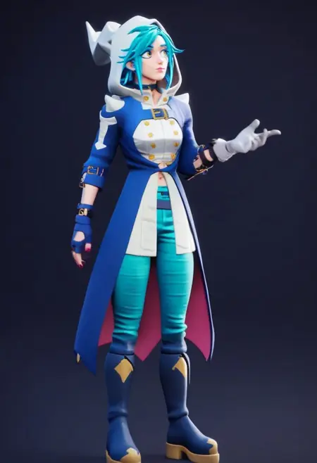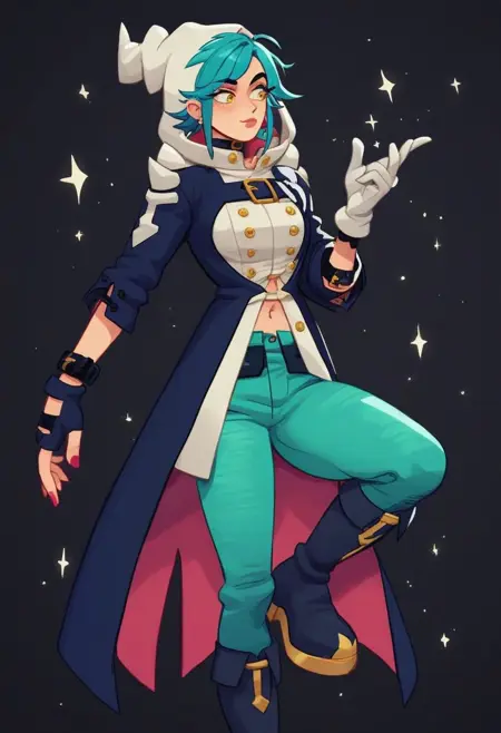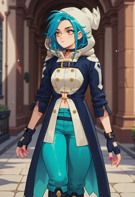 白い手袋、指先が開いた手袋、帽子、フード、白い頭部装飾、ブーツ、青いズボン、膝上ブーツ、黒い靴、ベルト、コート、チョーカー、ボタン、