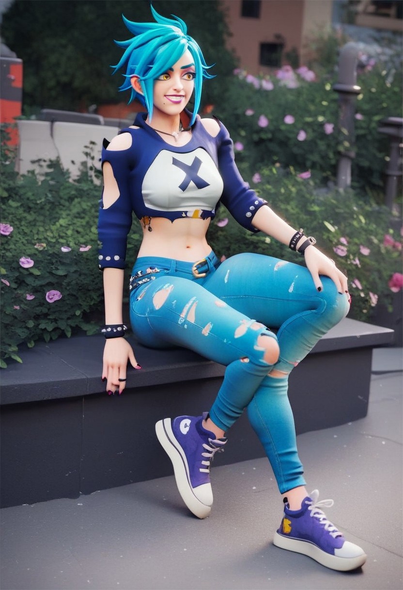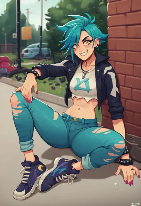 黄色い目、青い髪、ネイルポリッシュ、短い髪、へそ、