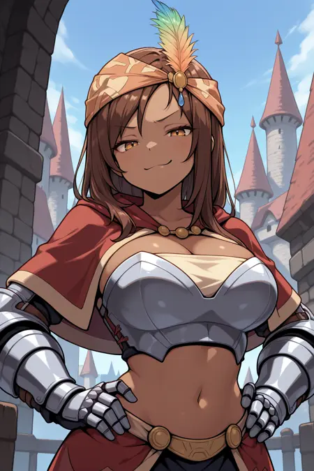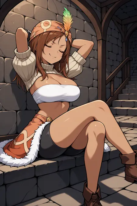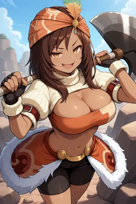 彼女の典型的な外見には、"オレンジ色のバンダナ、羽の髪飾り、タートルネック、ふくらはぎの短い袖、ベージュのショールトップ、白いバンデオ、胸元、お腹、黒いショートパンツ、オレンジ色のオーバースカート、ファーのトリム、指なし手袋" を追加してください。